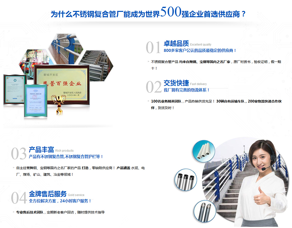 山東鑫旺通金屬制品有限公司座落在管材的生產(chǎn)基地--聊城市。 我公司引進(jìn)國(guó)外新技術(shù),專門生產(chǎn)不銹鋼復(fù)合管、不銹鋼復(fù)合管欄桿、不銹鋼/碳素鋼復(fù)合圓管、方管、橢圓管、橋梁護(hù)欄、景觀護(hù)欄等系列新型材料的企業(yè)。公司占地6萬(wàn)余平方米,設(shè)有生產(chǎn)基地、銷售公司、研發(fā)中心等機(jī)構(gòu),是一家集科、工、貿(mào)為一體的高新企業(yè)。公司外復(fù)不銹鋼復(fù)合管車間擁有八條自主知識(shí)產(chǎn)權(quán)生產(chǎn)線,專業(yè)從事外復(fù)不銹鋼/碳素鋼復(fù)合管生產(chǎn)及工程設(shè)計(jì)、制作、安裝、施工。先進(jìn)的生產(chǎn)工藝和嚴(yán)格的檢測(cè)手段,使企業(yè)產(chǎn)品全部通過(guò)不銹鋼復(fù)合管國(guó)家標(biāo)準(zhǔn)(GB/T18704-2008)。